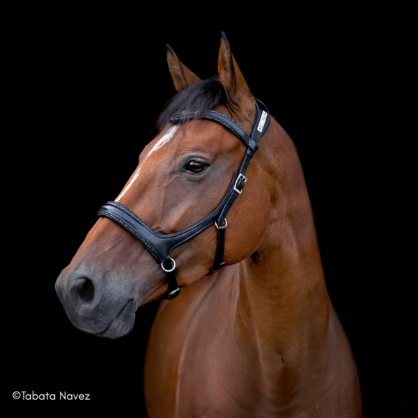 Un sidepull personnalisable en cuir de vachette, doublé et matelassé au niveau de la têtière anatomique et de la muserolle pour garantir un confort optimal au cheval.